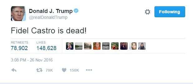 «Ο Φιντέλ Κάστρο είναι νεκρός!» Αυτή τη φράση ανάρτησε ο Ντόναλντ Τραμπ στον λογαριασμό του στο Twitter όταν έμαθε την είδηση για τον θάνατο του ιστορικού ηγέτη της Κούβας