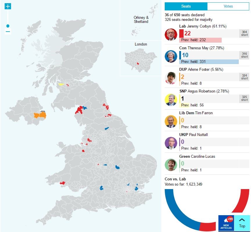 Καθώς συνεχίζεται η καταμέτρηση των ψήφων και οι ανακοινώσεις από τις εκλογικές περιφέρειες, οι Εργατικοί του Τζέρεμι Κόρμπιν προηγούνται αυτή την ώρα με 22 έδρες, έναντι 10 εδρών για τους Συντηρητικούς.