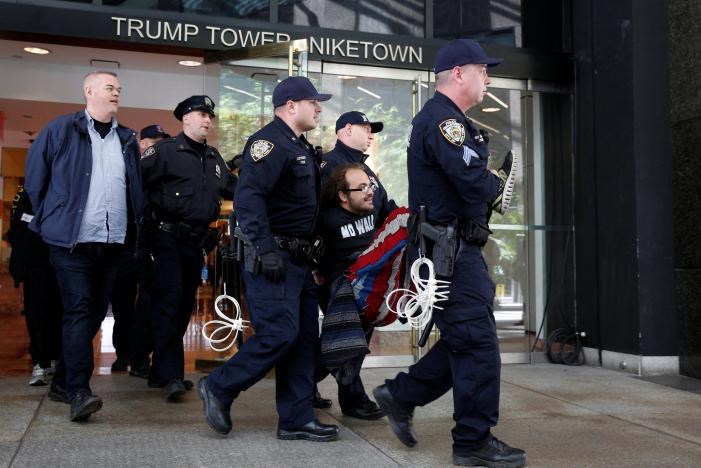 Η αστυνομία της Νέας Υόρκης συνέλαβε χθες 25 ανθρώπους στο λόμπι του Πύργου Τραμπ που διαμαρτύρονταν για τις πολιτικές του προέδρου Ντόναλντ Τραμπ όσον αφορά στη μετανάστευση και τον έλεγχο των συνόρων.Οι διαδηλωτές είχαν καθίσει μπροστά στους ανελκυστήρες και φώναζαν ρυθμικά το σύνθημα «όχι στην απαγόρευση, όχι στις εφόδους, όχι στο τείχος!». Η αστυνομία απέκλεισε την είσοδο στο πιο γνωστό ακίνητο του Τραμπ, έναν ουρανοξύστη όπου υπάρχουν τόσο καταστήματα όσο και κατοικίες, και όπου διαμένουν η σύζυγός του Μελάνια και ο γιος του Μπάρον όταν ο πρόεδρος βρίσκεται στην Ουάσινγκτον.Καθώς μια βαριά οπλισμένη ομάδα αστυνομικών, που φορούσαν αλεξίσφαιρα, απέκλεισε τις εισόδους, άλλοι αστυνομικοί μετέφεραν, παρά τη θέλησή τους, τους διαδηλωτές σε αυτοκίνητα της αστυνομίας.