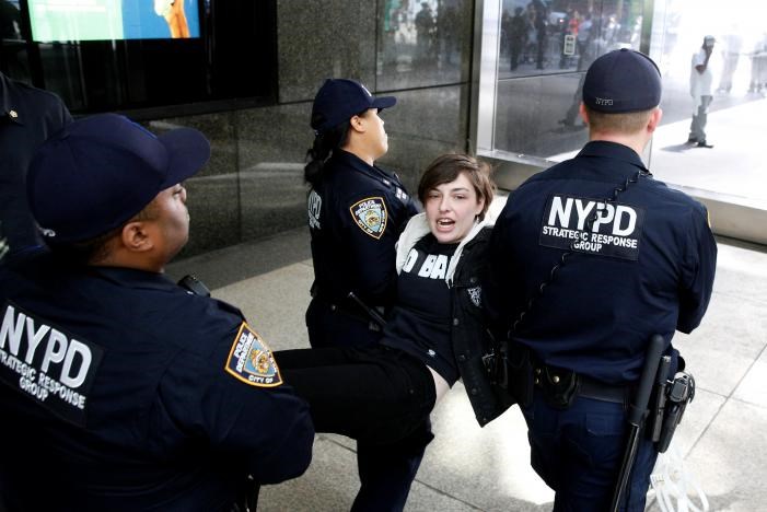 Η αστυνομία της Νέας Υόρκης συνέλαβε χθες 25 ανθρώπους στο λόμπι του Πύργου Τραμπ που διαμαρτύρονταν για τις πολιτικές του προέδρου Ντόναλντ Τραμπ όσον αφορά στη μετανάστευση και τον έλεγχο των συνόρων.Οι διαδηλωτές είχαν καθίσει μπροστά στους ανελκυστήρες και φώναζαν ρυθμικά το σύνθημα «όχι στην απαγόρευση, όχι στις εφόδους, όχι στο τείχος!». Η αστυνομία απέκλεισε την είσοδο στο πιο γνωστό ακίνητο του Τραμπ, έναν ουρανοξύστη όπου υπάρχουν τόσο καταστήματα όσο και κατοικίες, και όπου διαμένουν η σύζυγός του Μελάνια και ο γιος του Μπάρον όταν ο πρόεδρος βρίσκεται στην Ουάσινγκτον.Καθώς μια βαριά οπλισμένη ομάδα αστυνομικών, που φορούσαν αλεξίσφαιρα, απέκλεισε τις εισόδους, άλλοι αστυνομικοί μετέφεραν, παρά τη θέλησή τους, τους διαδηλωτές σε αυτοκίνητα της αστυνομίας.