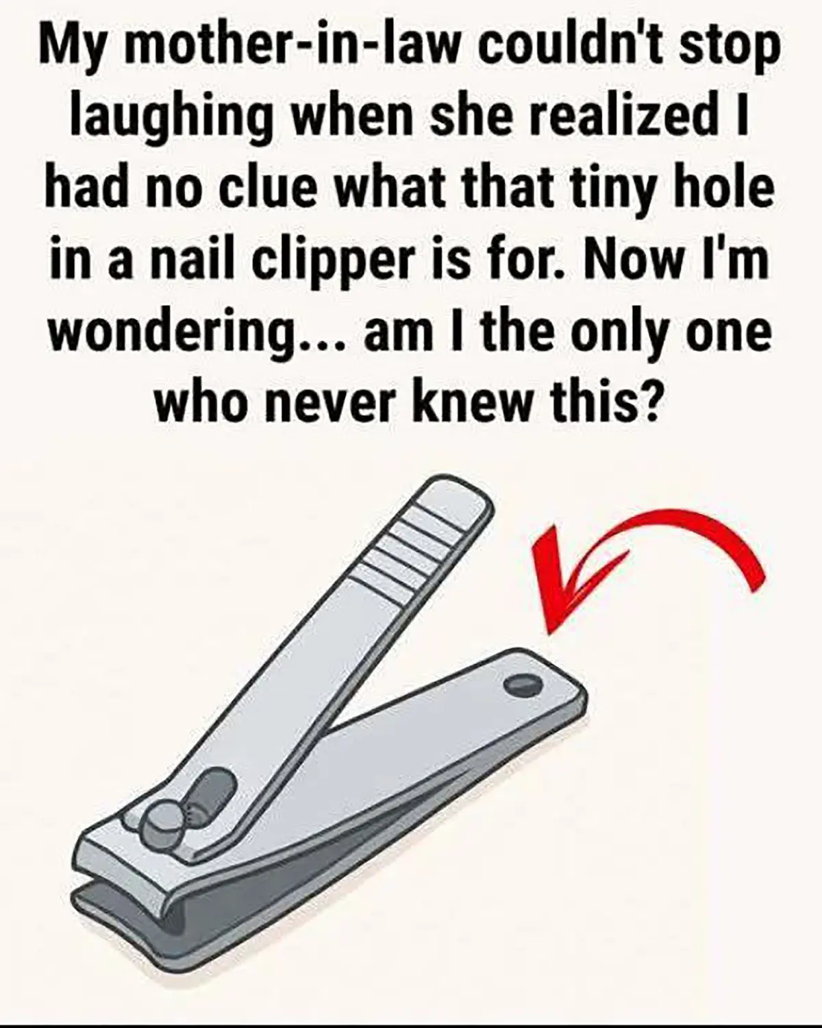 Ένας χρήστης του Facebook πυροδότησε τη συζήτηση όταν μοιράστηκε το εξής: «Η πεθερά μου δεν μπορούσε να σταματήσει να γελάει όταν συνειδητοποίησε ότι δεν είχα ιδέα σε τι χρησιμεύει η μικρή τρύπα στον νυχοκόπτη. Τώρα αναρωτιέμαι… είμαι ο μόνος που δεν το ήξερε;».