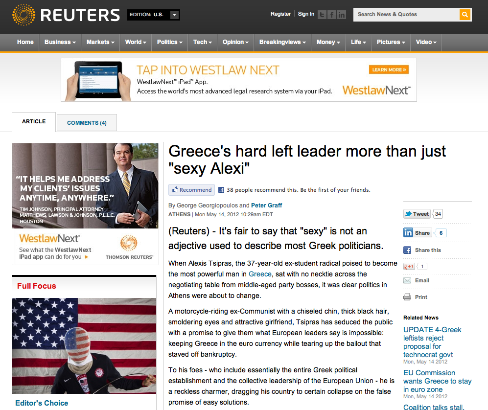 «Ο σκληρός αριστερός ηγέτης της Ελλάδας είναι κάτι παραπάνω από… sexy Alexi”, γράφει το Reuters σε άρθρο του για τον Αλέξη Τσίπρα.”Θα ήταν δίκαιο να πούμε πως το «σέξι» δεν είναι ένα επίθετο που θα χρησιμοποιούσαμε για περιγράψουμε έναν Έλληνα πολιτικό. Όταν όμως ο Αλέξης Τσίπας, ο 37χρονος πρώην φοιτητής, ο οποίος τείνει να γίνει ο ισχυρότερος άνθρωπος στην Ελλάδα, κάθισε στο τραπέζι των διαπραγματεύσεων χωρίς γραβάτα απέναντι από τους μεσήλικες ηγέτες των άλλων κομμάτων, ήταν ξεκάθαρο πως η πολιτική στην Αθήνα επρόκειτο να αλλάξει”, γράφει το Reuters.Το διεθνές ειδησεογραφικό πρακτορείο περιγράφει τα χαρίσματα, αλλά και των προθέσεων του ηγέτη της Αριστεράς: “Σαν πρώην κομουνιστής, ο οποίος ιππεύει μοτοσικλέτα, έχει ένα λαξευτό πιγούνι, πυκνά μαύρα μαλλιά, μάτια που σιγοκαίνε και μια ελκυστική σύντροφο, ο Τσίπρας έχει παρασύρει τον κόσμο δίνοντας την υπόσχεση ότι θα τους δώσει αυτό που οι άλλοι ηγέτες θεωρούν αδύνατο: Την παραμονή της Ελλάδας στην Ευρωζώνη και παράλληλα την κατάργηση του μνημονίου”.