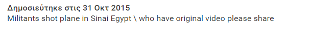 Ο Arnush Magreebe που το δημοσίευσε πρώτος γράφει στην περιγραφή: “Στρατιωτικοί χτύπησαν αεροπλάνο στην Αίγυπτο. Όποιος έχει το γνήσιο βίντεο, παρακαλώ να το δημοσιεύσει”.