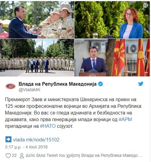 Μάλιστα συνέχισε τα περί… εισόδου στο ΝΑΤΟ, χρησιμοποιώντας σταθερά τον όρο «Μακεδονία» και «Μακεδονικός Στρατός», χωρίς να υπάρχει πουθενά ο όρος «βόρεια». Κάτι που ίσως δίνει το… στίγμα για το πώς θα αποκελείται η γειτονική χώρα όταν (και αν) επικυρωθεί η συμφωνία στα δύο κοινοβούλια.