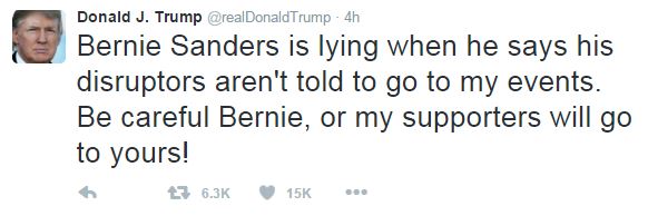 «Ο Μπέρνι Σάντερς ψεύδεται όταν υποστηρίζει ότι οι διαδηλωτές δεν πήραν εντολές να έρθουν στις συγκεντρώσεις μου. Προσοχή, Μπέρνι, αλλιώς οι δικοί μου υποστηρικτές θα έρθουν στις συγκεντρώσεις σου!» έγραψε στο ιστότοπο κοινωνικής δικτύωσης Twitter ο δισεκατομμυριούχος.