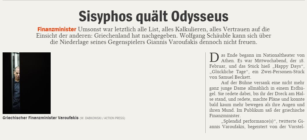 «Ο Σίσυφος βασανίζει τον Οδυσσέα», σχολιάζει στον τίτλο του το γερμανικό περιοδικό, παρουσιάζοντας ως Σίσυφο τον κ. Σόιμπλε και τον κ. Βαρουφάκη ως Οδυσσέα. Σχολιάζοντας την τελική έκβαση της μαραθώνιας διαπραγμάτευσης με αποκορύφωμα το Γιούρογκρουπ της 20ης Ιανουαρίου, το Spiegel σημειώνει: «Τελικά όλη η πανουργία, οι υπολογισμοί, όλη η εμπιστοσύνη του ενός στην κατανόηση του άλλου, ήταν μάταια: Η Ελλάδα υποχώρησε. Ωστόσο, ο Βόλφγκανγκ Σόιμπλε δεν μπορεί να χαρεί για την ήττα του αντιπάλου του, Γιάνη Βαρουφάκη».