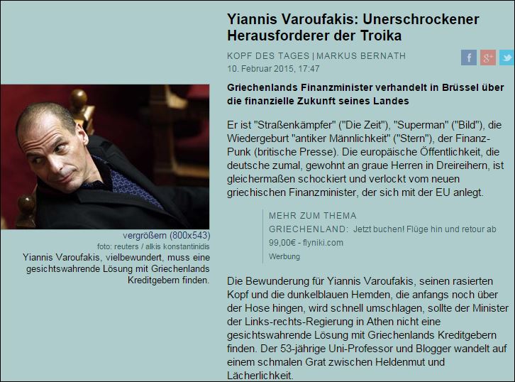 Στην αρχή η εφημερίδα παραθέτει μια σειρά χαρακτηρισμών που του έχουν δοθεί ήδη από άλλα γερμανόφωνα έντυπα, όπως: «Μαχητής στο δρόμο», «Σούπερμαν», «Η αναγέννηση αρχαίου ανδρισμού», σημειώνοντας ότι η ευρωπαϊκή κοινή γνώμη και πολύ περισσότερο η γερμανική, που είναι συνηθισμένη σε μεσήλικες με σταυρωτό κοστούμι, είναι συγχρόνως σοκαρισμένη και ενθουσιασμένη από τον νέο Έλληνα υπουργό Οικονομικών που «τα βάζει» με την Ευρωπαϊκή Ένωση.