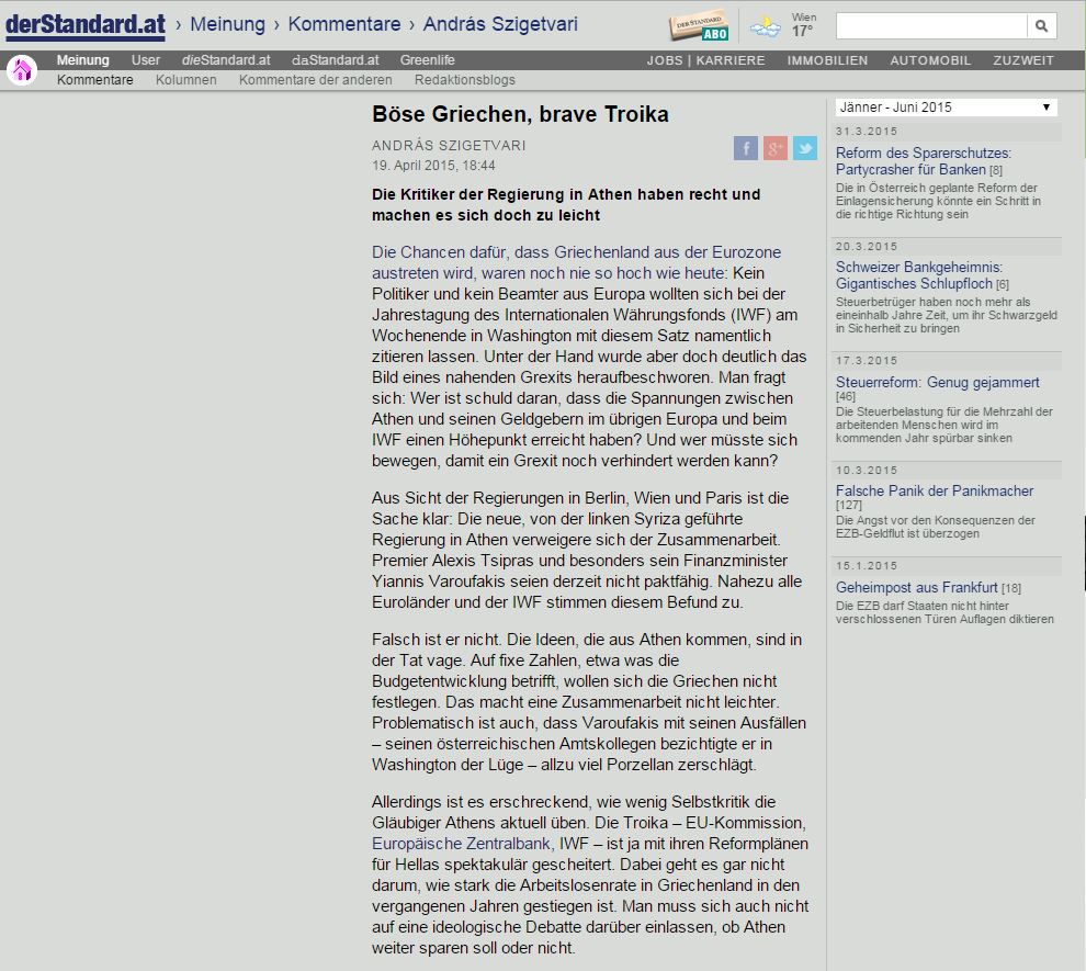 «Εάν όλο αυτό το χρονικό διάστημα δεν ήταν δυνατό να διαμορφώσει λογικά ένα συγκριτικά απλό σημείο, όπως ο φοροεισπρακτικός μηχανισμός, τότε η τρόικα απέτυχε τουλάχιστον το ίδιο όπως οι Έλληνες», γράφει η «Der Standard» για να αναρωτηθεί στη συνέχεια «πού ήταν λοιπόν όλοι αυτοί οι ελεγκτές», και στη συνέχεια να συμπεράνει πως «είτε δεν έλαβαν σοβαρά τους ίδιους τους όρους τους, είτε αποδέχθηκαν κάθε καθυστέρηση».