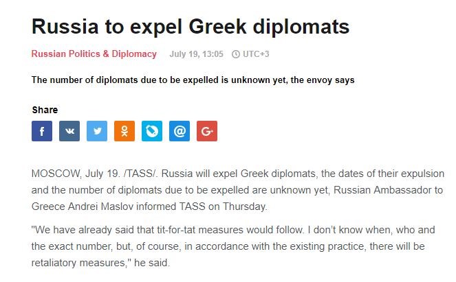 Η Ρωσία θα απελάσει Έλληνες διπλωμάτες, οι ημερομηνίες απέλασής τους και ο αριθμός των διπλωματών που πρόκειται να απελαθούν δεν έχουν ακόμα διευκρινιστεί, δήλωσε ο Πρέσβης της Ρωσίας στην Ελλάδα Αντρέι Μάσλοφ μιλώντας στο πρακτορείο TASS.