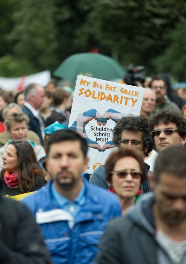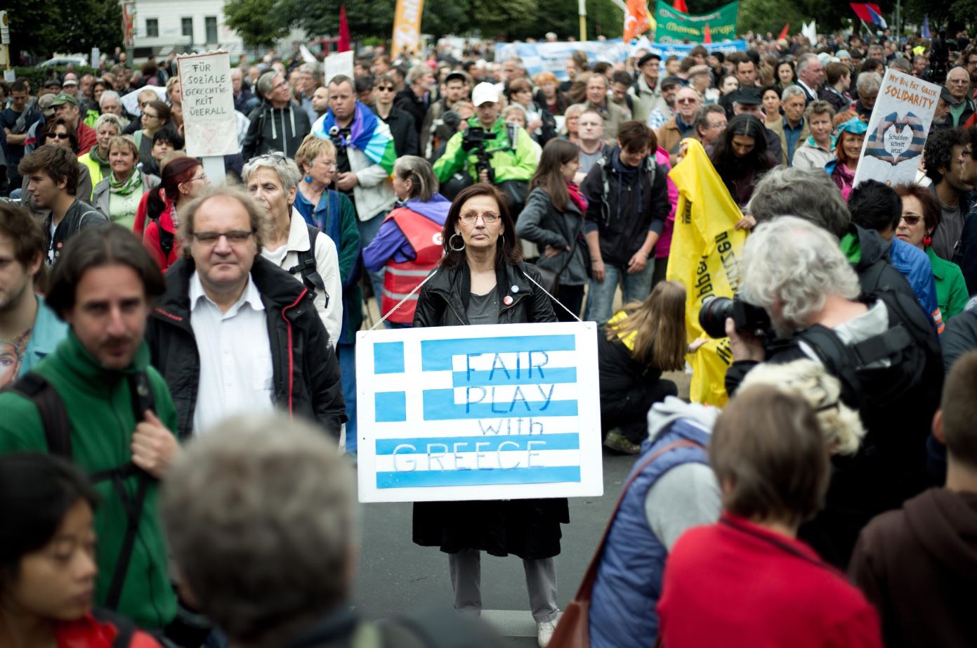 Ορισμένοι διαδηλωτές κρατούσαν επίσης ελληνικές σημαίες ή πλακάτ με συνθήματα υπέρ της Αθήνας. “Η τεχνοκρατική, ψυχρή και νεοφιλελεύθερη Ευρώπη υπό τη διοίκηση της Γερμανίας είναι ανυπόφορη”, έγραφε ένα πανώ.