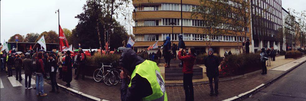 Ανταποκρινόμενοι στο κάλεσμα ενώσεων, συνδικάτων και κομμάτων της βελγικής αριστεράς, οι διαδηλωτές ενώθηκαν με περίπου 120 μέλη της “ευρωπορείας” που είχαν ξεκινήσει από την Ισπανία, τη Γαλλία, την Ιταλία και την Ελλάδα. Αφού παρακολούθησαν, υπό βροχή, μια συναυλία, ομάδες διαδηλωτών αναπτύχθηκαν γύρω από τα κτίρια της Ευρωπαϊκής Επιτροπής, του Ευρωπαϊκού Κοινοβουλίου και του Ευρωπαϊκού Συμβουλίου, όπου συνεδριάζουν οι ηγέτες των “28” με αντικείμενο τη μεταναστευτική κρίση στην Ευρώπη.
