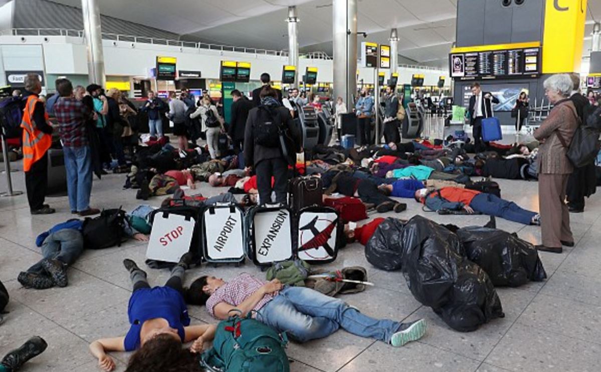 Οι διαδηλωτές ξάπλωσαν στο πάτωμα του Τερματικού Σταθμού 2 του Χίθροου και πολλοί εξ αυτών φόραγαν λευκές μάσκες για να καταγγείλουν τον αντίκτυπο των αεροπορικών μετακινήσεων στην κλιματική αλλαγή και τα επίπεδα της ατμοσφαιρικής ρύπανσης.