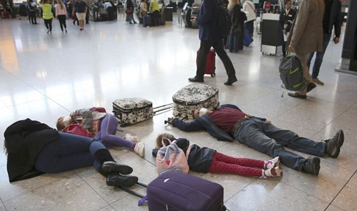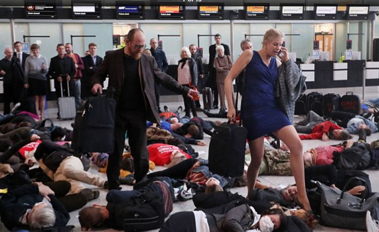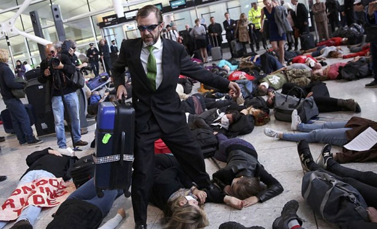 Περισσότεροι από 100 πολίτες διαδήλωσαν σήμερα στο αεροδρόμιο Χίθροου του Λονδίνου, δεκάδες εκ των οποίων υποδύθηκαν τους νεκρούς έχοντας σωριαστεί στο πάτωμα ενός τερματικού σταθμού.