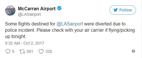 “Πτήσεις με προορισμό το αεροδρόμιο του Λας Βέγκας ακυρώθηκαν εξαιτίας αστυνομικού συμβάντος. Παρακαλούμε επικοινωνήστε με την αεροπορική εταιρεία σας” αναφέρει ανάρτηση του αεροδρομίου McCarran στο Twitter.
