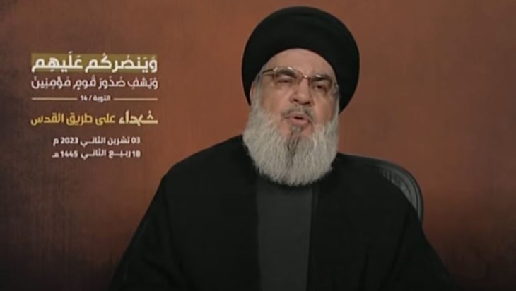 Έκανε λόγο για πρωτοφανείς διασυνοριακές μάχες με το Ισραήλ και απείλησε με κλιμάκωση. Ωστόσο απέφυγε να ανακοινώσει πλήρη εμπλοκή της σιιτικής οργάνωσης στον πόλεμο Ισραήλ-Χαμάς. Είπε μόνο ότι οι μάχες στα σύνορα Λιβάνου-Ισραήλ “δεν θα περιοριστούν” στην κλίμακα που έχει παρατηρηθεί μέχρι τώρα. Δήλωσε ότι όλα τα ενδεχόμενα είναι ανοιχτά στο μέτωπο του πολέμου και δήλωσε: «Είμαστε έτοιμοι για όλα τα ενδεχόμενα».