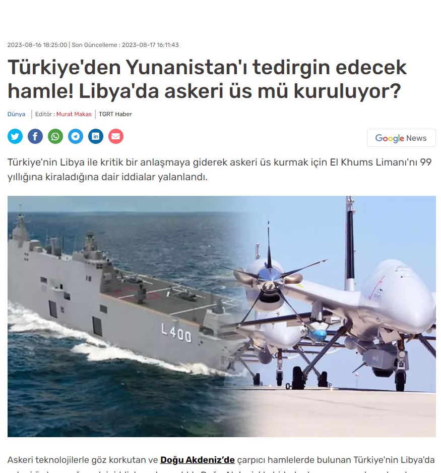 Αφού παραθέτει το ρεπορτάζ του και τις πηγές του, που είναι αναρτήσεις στα social media, το TGRT Haber στο ίδιο κείμενο γράφει: «Ωστόσο, η τελευταία δήλωση από τη Λιβύη διέψευσε αυτή την εξέλιξη. Ο εκπρόσωπος της κυβέρνησης της Εθνικής Ενότητας της Λιβύης Mohammed Hamuda διέψευσε τις αναφορές ότι η Τουρκία μίσθωσε το λιμάνι Khums στην πόλη Khums στη Λιβύη για μια περίοδο 9-9 ετών για να δημιουργήσει μια στρατιωτική βάση.»
