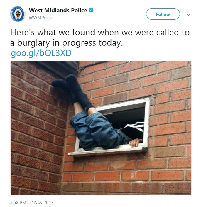Όταν το περιπολικό έφθασε στο φαστφουντάδικο, το πρώτο που σκέφθηκαν να κάνουν οι αστυνομικοί ήταν να απαθανατίσουν την γελοία σκηνή και να την αναρτήσουν στο Twitter. Χαρακτηριστικό είναι ότι οι πυροσβέστες χρειάστηκαν 40 ολόκληρα λεπτά για να απεγκλωβίσουν τον διαρρήκτη… της κακιάς ώρας.