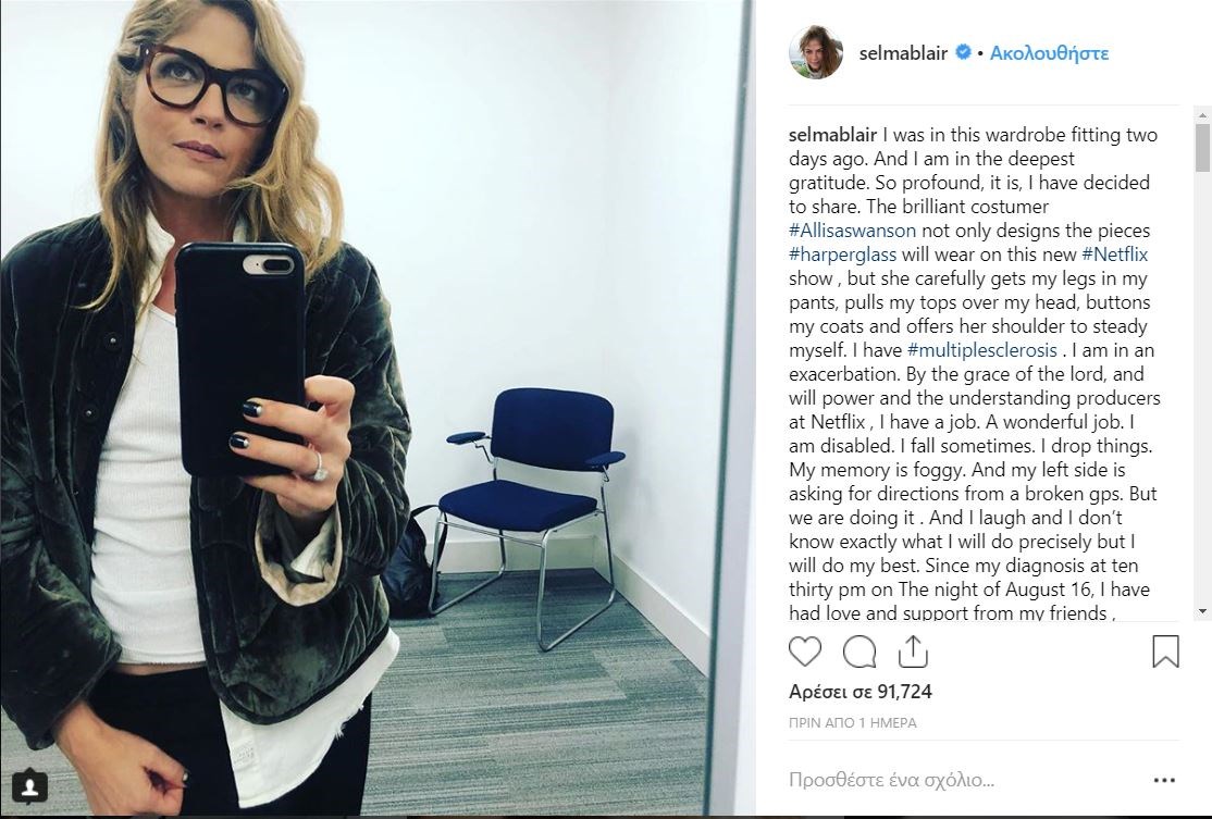 Σοκάρει η εξομολόγηση της γνωστής ηθοποιού Σέλμα Μπλερ σχετικά με την κατάσταση της υγείας της. Σε ανάρτησή της στο instagram αποκάλυψε ότι έχει σκλήρυνση κατά πλάκας και μάλιστα παρουσιάζει επιδείνωση.«Έχω σκλήρυνση κατά πλάκας. Έχει παρουσιάσει επιδείνωση. Όμως δόξα στο Θεό και τη δύναμη της θέλησης και τους παραγωγούς μου, έχω μια δουλειά. Μια υπέροχη δουλειά. Είμαι άτομο σε ειδικές ανάγκες. Πέφτω μερικές φορές. Ρίχνω πράγματα. Η μνήμη μου είναι θολή. Και η αριστερή μου πλευρά ζητά οδηγίες από ένα χαλασμένο gps. Αλλά τα καταφέρνουμε. Και γελώ και δεν ξέρω ακριβώς τι θα κάνω αλλά θα κάνω ό,τι καλύτερο μπορώ. Από τη στιγμή που διαγνώστηκε η ασθένειά μου στις 10.30 το βράδυ της 16ης Αυγούστου, έλαβα αγάπη και υποστήριξη… Είμαι στα βαθιά αλλά ελπίζω να μπορώ να προσφέρω ελπίδα σε άλλους, ακόμη και στον εαυτό μου. Δεν μπορείς να λάβεις βοήθεια αν δεν τη ζητήσεις. Μπορεί να είναι αφόρητο στην αρχή, θες να κοιμηθείς, θέλεις να κοιμάσαι συνέχει. Οπότε δεν έχω απαντήσεις. Βλέπετε, θέλω να κοιμηθώ. Αλλά είμαι πανέτοιμη και θέλω η ζωή μου να είναι γεμάτη. Θέλω να παίξω με τον γιο μου ξανά. Θέλω να περπατήσω και πάλι και να ιππεύσω το άλογό μου. Έχω σκλήρυνση κατά πλάκας και είμαι καλά. Αν με δείτε να ρίχνω πράγματα στον δρόμο, βοηθήστε με να τα μαζέψω. Μου παίρνει ολόκληρη μέρα να το κάνω μόνη μου. Σας ευχαριστώ. Μπορεί να ζήσουμε όμορφες μέρες μέσα σ’ αυτές τις προκλήσεις” γράφει μεταξύ άλλων η ηθοποιός.
