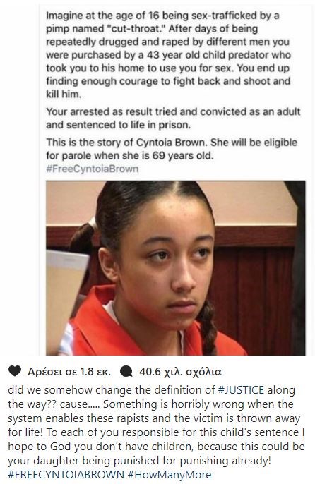 Η ιστορία της Σιντόγια Μπράουν ήρθε ξανά στη δημοσιότητα αφού η τραγουδίστρια Ριάνα, απευθυνόμενη στους 58,2 εκατομμύρια ακολούθους της στο Instagram, έγραψε: “Σκεφτείτε να σας αναγκάζουν να εκπορνευθείτε στην ηλικία των 16 ετών”.