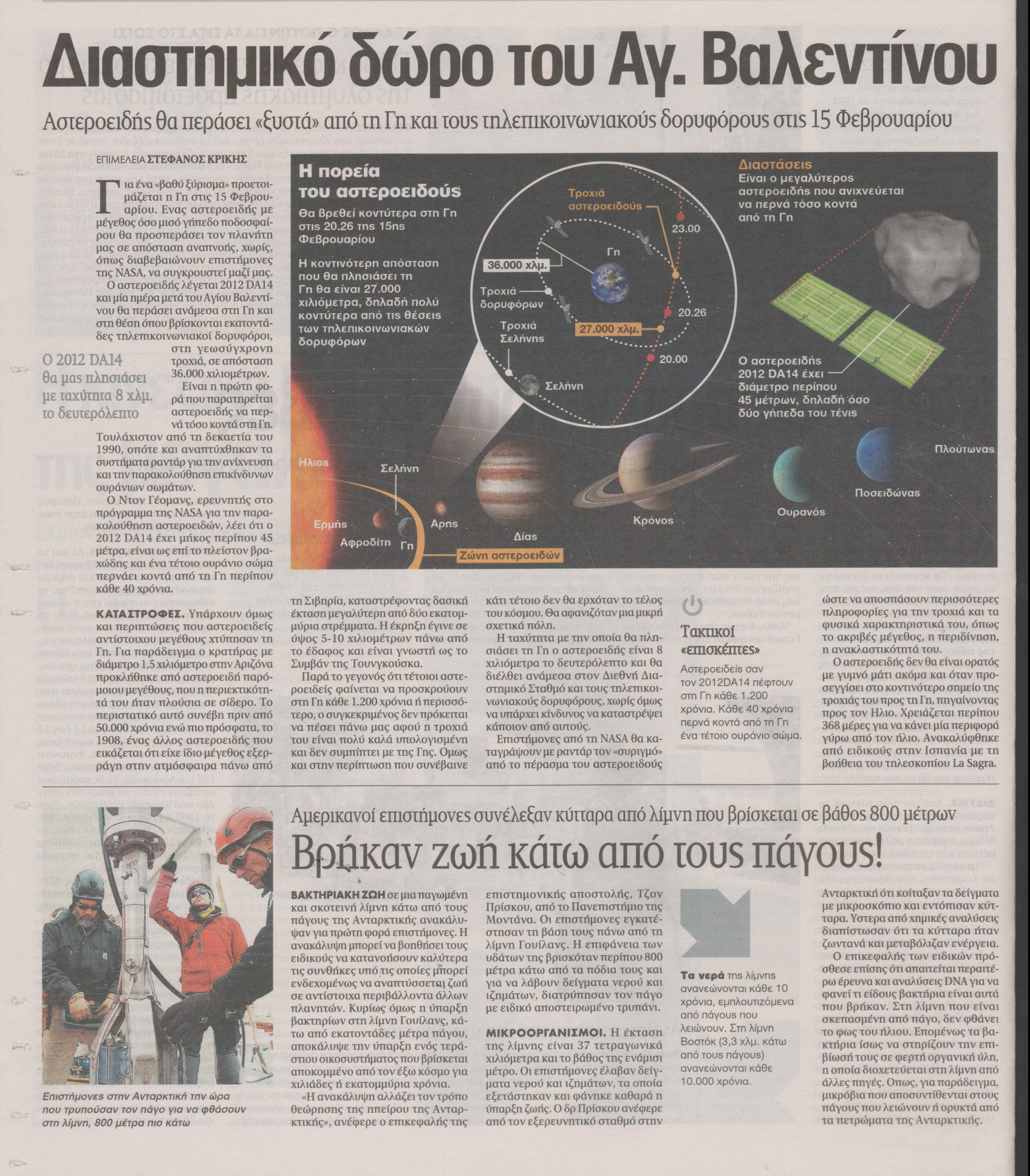 Ο αστεροειδής λέγεται 2012 DA14 και μία ημέρα μετά του Αγίου Βαλεντίνου θα περάσει ανάμεσα στη Γη και στη θέση όπου βρίσκονται εκατοντάδες τηλεπικοινωνιακοί δορυφόροι, στη γεωσύγχρονη τροχιά, σε απόσταση 36.000 χιλιομέτρων.