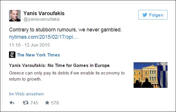 «Πώς να διαχειριστεί κάποιος την κατάσταση με τη νέα ελληνική κυβέρνηση;» ρωτά η εφημερίδα και παραθέτει στη συνέχεια tweet του Γιάνη Βαρουφάκη μέσω του οποίου πόσταρε παλιότερο άρθρο του (από τις 12 Φεβρουαρίου 2015) στο οποίο έγραψε: «Εν αντιθέσει με τις επίμονες φήμες, ποτέ δεν τζογάραμε».