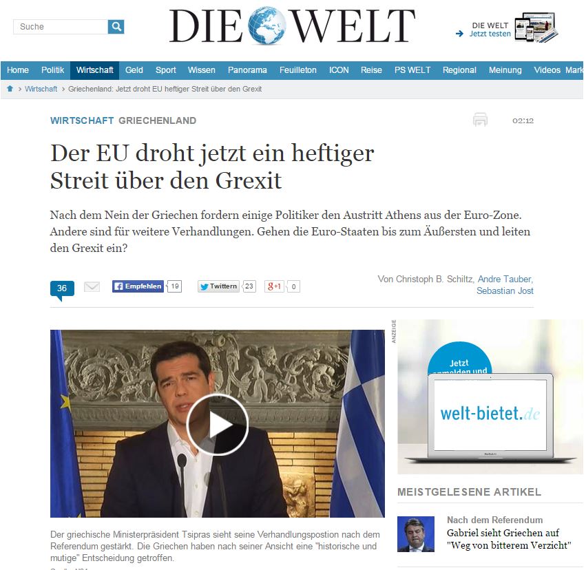 «Τώρα η ΕΕ απειλείται με μια έντονη διαμάχη σχετικά με ένα Grexit», είναι ο τίτλος της εφημερίδας Die Welt, η οποία εξηγεί ότι μετά το «όχι» των Ελλήνων μερικοί πολιτικοί ζητούν την έξοδο της Ελλάδας από την ευρωζώνη, ενώ άλλοι τάσσονται υπέρ της συνέχισης των διαπραγματεύσεων.