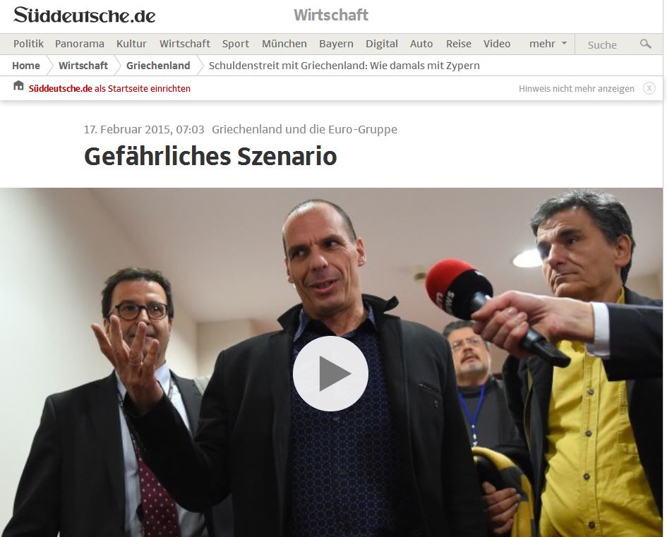 Για «επικίνδυνο σενάριο» κάνει λόγο σε σχόλιό της η «Sueddeutsche Zeitung» επισημαίνοντας ότι η αντιπαράθεση της Ελλάδας με τις άλλες χώρες του Eurogroup θυμίζει την περίπτωση της Κύπρου, αλλά είναι ακόμη πιο δύσκολη. «Η αναστάτωση ήταν αναμενόμενη. Το γεγονός ότι ήρθε τόσο γρήγορα όμως, όχι. Οι διαπραγματεύσεις των υπουργών Οικονομικών των 18 χωρών του ευρώ με τον Έλληνα ομόλογό τους Γιάνη Βαρουφάκη τελείωσαν μετά από μια ολόκληρη ώρα. Καμία συμφωνία για περαιτέρω οικονομική βοήθεια, καμία συμφωνία για την συνέχιση των διαπραγματεύσεων. Τίποτα», αναφέρει η αρθρογράφος, η οποία πάντως εκτιμά ότι η ΕΚΤ δεν μπορεί να δώσει ένα τελεσίγραφο ανάλογο με αυτό που δόθηκε στην Κύπρο, διότι τότε θα προκαλούσε την αντίδραση εκατομμυρίων ανθρώπων στον ευρωπαϊκό Νότο. «Αυτό το σενάριο έχει σίγουρα εξετασθεί από το Eurogroup και τη γερμανική κυβέρνηση και διαπιστώθηκε ότι είναι επικίνδυνο» σημειώνει και προσθέτει ότι δεν έχει ειπωθεί ακόμη η τελευταία λέξη σε ό,τι αφορά την Ελλάδα.