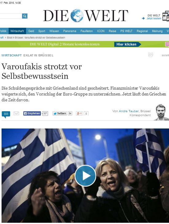 «Ο Βαρουφάκης ξεχειλίζει αυτοπεποίθηση» τιτλοφορείται δημοσίευμα της εφημερίδας «Die Welt» η οποία κάνει λόγο για μεγάλη απογοήτευση των υπουργών Οικονομικών του Eurogroup για το γεγονός ότι η ελληνική κυβέρνηση δεν παρουσίασε λίστα με συγκεκριμένα μέτρα.