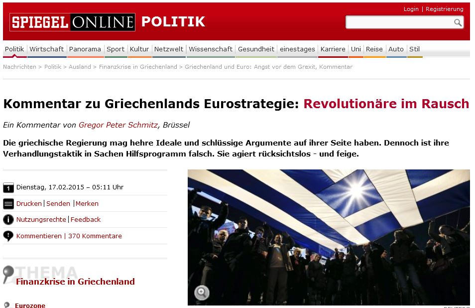 «Επαναστάτες σε έκσταση» είναι ο τίτλος άρθρου της ηλεκτρονικής έκδοσης του περιοδικού «Der Spiegel» στο οποίο επισημαίνεται ότι «η ελληνική κυβέρνηση μπορεί να έχει ευγενή ιδανικά και λογικά επιχειρήματα, αλλά η διαπραγματευτική τακτική της στο θέμα του προγράμματος βοήθειας είναι εσφαλμένη. Αντιδρά αδιάφορα και ύπουλα». Στο ίδιο δημοσίευμα αναφέρεται ότι οι συνομιλητές του Αλέξη Τσίπρα και του Γιάνη Βαρουφάκη το τελευταίο διάστημα κάνουν λόγο για «πόζα, ισχυρογνωμοσύνη και ελλιπή γνώση λεπτομερειών από τους δύο πολιτικούς».
