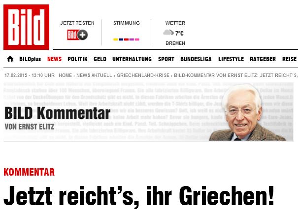 «Φτάνει τώρα, Έλληνες!» είναι ο τίτλος της «Bild» η οποία επισημαίνει ότι η Ελλάδα δεν περιμένει να την διώξουν από την Ευρωζώνη, διώχνει η ίδια τον εαυτό της και υποστηρίζει ότι η Ευρώπη θα πάει καλύτερα χωρίς την Ελλάδα στο ευρώ. Σε άλλο άρθρο της αναφέρει ότι «η χώρα απειλείται με χρεοκοπία και οι Έλληνες τζογάρουν» ενώ τονίζεται ότι «ο Έλληνας υπουργός Οικονομικών αφήνει το Eurogroup για το θέμα της χώρας του να διαλυθεί και μετά δηλώνει έτοιμος για συμβιβασμό».