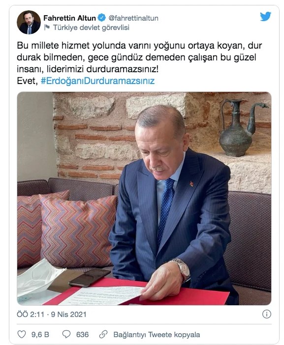 Ο διευθυντής επικοινωνίας της τουρκικής προεδρίας, Φαχρετίν Αλτούν, με νέα ανάρτησή του στο Twitter υπερασπίζεται τον Ρετζέπ Ταγίπ Ερντογάν, μετά τον σάλο που προκάλεσε ο τρόπος που συμπεριφέρθηκε στην Ούρσουλα Φον Ντερ Λάιεν, στο λεγόμενο “sofagate”. “Δεν μπορείτε να σταματήσετε αυτόν τον θαυμάσιο άνθρωπο, τον ηγέτη μας, ο οποίος εργάζεται μέρα νύχτα χωρίς να σταματά λεπτό, για να υπηρετεί τον λαό του” έγραψε χαρακτηριστικά.