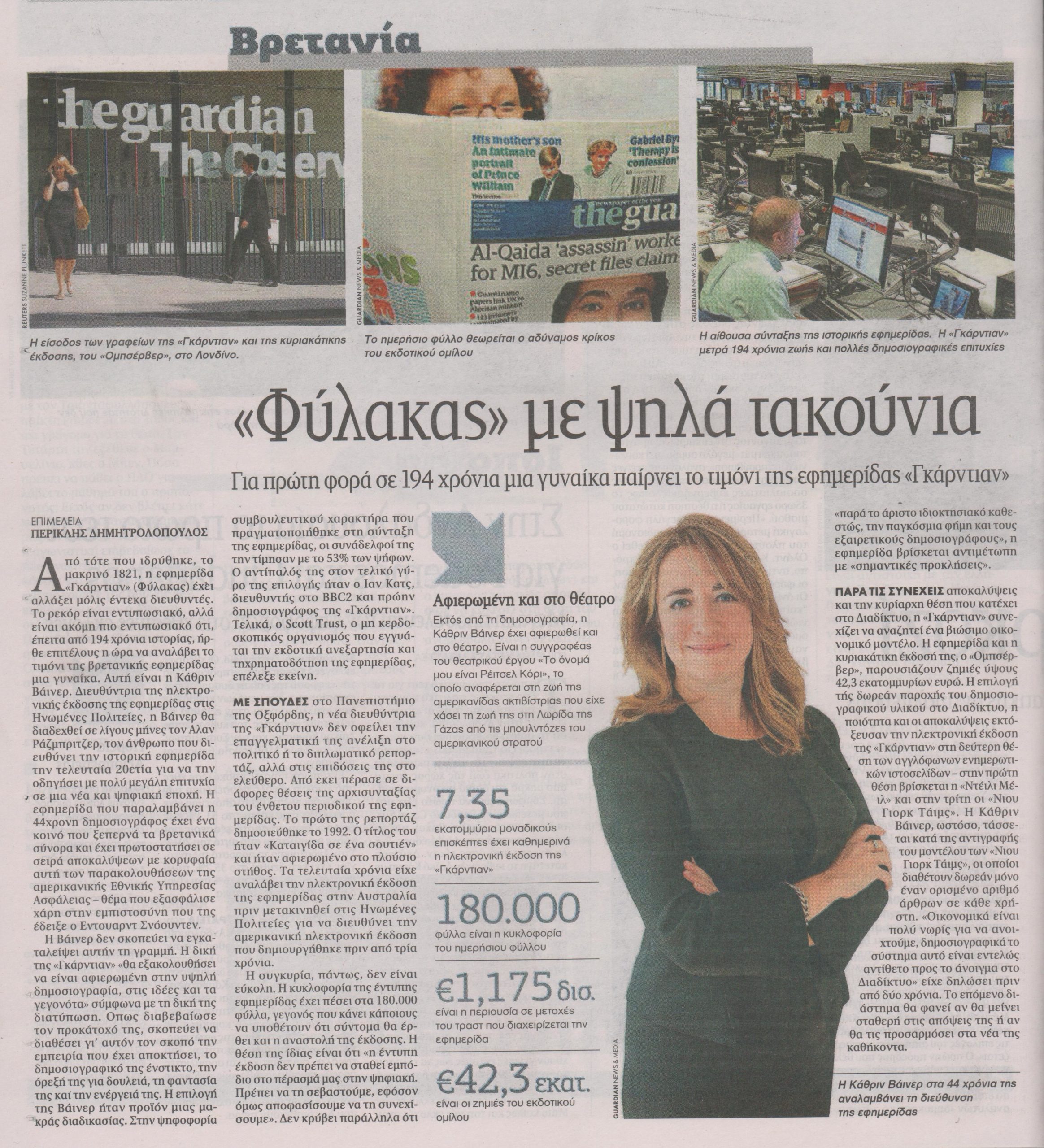 Από τότε που ιδρύθηκε, το μακρινό 1821, η εφημερίδα Guardian (Φύλακας) έχει αλλάξει μόλις έντεκα διευθυντές. Το ρεκόρ είναι εντυπωσιακό, αλλά είναι ακόμη πιο εντυπωσιακό ότι έπειτα από 194 χρόνια ιστορίας, ήρθε επιτέλους η ώρα να αναλάβει το τιμόνι της βρετανικής εφημερίδας μια γυναίκα. Αυτή είναι η Κάθριν Βάινερ.