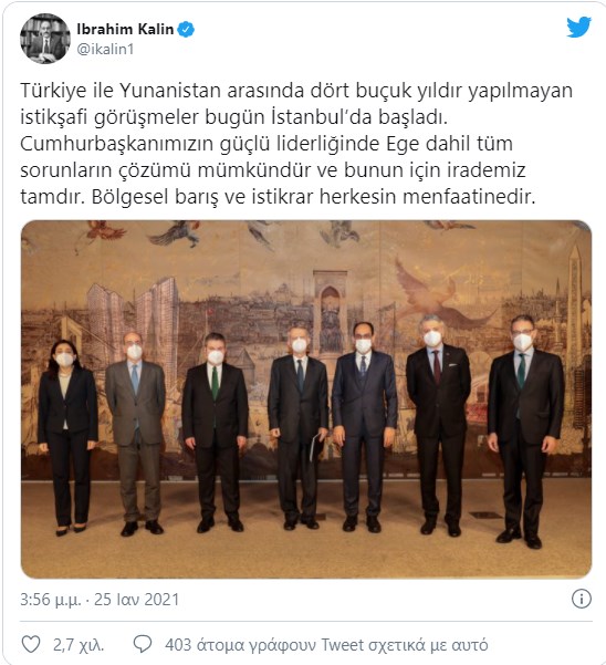 Η πρώτη επίσημη τοποθέτηση από την Τουρκία για τις σημερινές διερευνητικές επαφές με την Ελλάδα ήρθε μέσω Twitter από τον Ιμπραχίμ Καλίν.