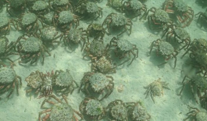 Μερικά εικοσιτετράωρα αφότου ένας ψαροντουφεκάς ισχυρίστηκε πως τον δάγκωσε καρχαρίας στα ανοικτά της Κορνουάλης, καβούρια-αράχνες έχουν συγκεντρωθεί στα ρηχά νερά της παραλίας Porthgwidden Beach, στο St Ives.