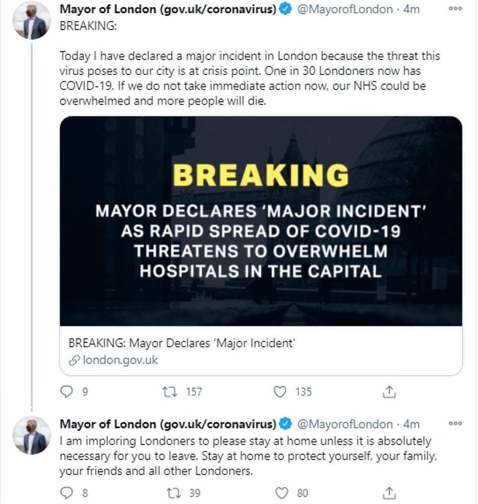 Κατάσταση «μείζονος συμβάντος» κήρυξε ο δήμαρχος του Λονδίνου Σαντίκ Καν στη βρετανική πρωτεύουσα, λέγοντας πως τα νοσοκομεία στο Λονδίνο μπορεί να καταρρεύσουν, αν ο κόσμος δεν μείνει στο σπίτι. «Σήμερα κήρυξα κατάσταση μείζονος συμβάντος στο Λονδίνο, επειδή η απειλή που δημιουργεί αυτός ο ιός για την πόλη μας βρίσκεται σε κρίσιμο σημείο», δήλωσε ο Καν προσθέτοντας πως «ένας στους 30 Λονδρέζους έχει τώρα Covid-19. Αν δεν αναλάβουμε δράση αμέσως, η NHS (η Εθνική Υπηρεσία Υγείας) μπορεί να καταρρεύσει και περισσότεροι άνθρωποι θα πεθάνουν».