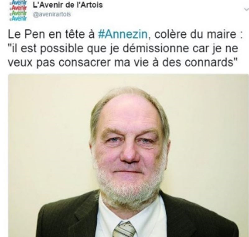 Έτοιμος να παραιτηθεί, επειδή οι συμπολίτες του στήριξαν στις χθεσινές εκλογές τη Μαρίν Λεπέν, δηλώνει ο δήμαρχος της πόλης, Ανεζίν.«Είναι καταστροφή. Υπάρχει η πιθανότητα να παραιτηθώ γιατί δεν θέλω να αφιερώσω τη ζωή μου σε μ….» είπε ο Ντανιέλ Ντελομέζ, σχολιάζοντας με αυτόν τον τρόπο το 38% που πήρε στην πόλη του το ακροδεξιό «Εθνικό Μέτωπο» της Μαρίν Λεπέν.Δεύτερος στην Ανεζίν ήρθε ο αριστερός υποψήφιος Ζαν Λικ Μελανσόν με 19,25%.Ο Ντανιέλ Ντελομέζ έκανε την συγκεκριμένη δήλωση στην γαλλική εφημερίδα «L’Avenir de l’Artois» και αμέσως αναπαράχθηκε χιλιάδες φορές στο διαδίκτυο, στην μεγάλη πλειοψηφία από πολίτες που εξέφρασαν την συμπαράστασή τους στον δήμαρχο.