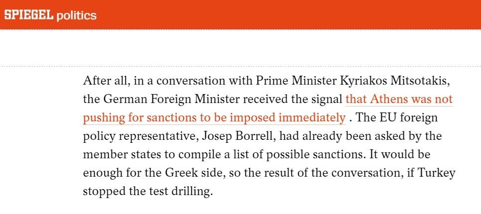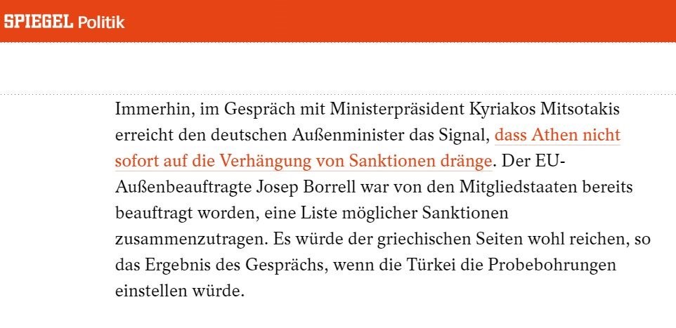 Συγκεκριμένα το Spiegel γράφει: “Σε τελική ανάλυση, σε μια συνομιλία με τον Πρωθυπουργό Κυριάκο Μητσοτάκη, ο Γερμανός Υπουργός Εξωτερικών έλαβε το μήνυμα ότι η Αθήνα δεν πιέζει να επιβληθούν αμέσως κυρώσεις”.