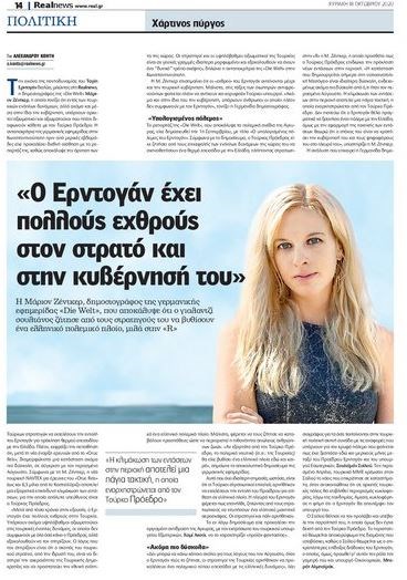 Την εικόνα της παντοδυναμίας του Ταγίπ Ερντογάν διαλύει, μιλώντας στη Realnews, η δημοσιογράφος της «Die Welt» Μάριον Ζέντκερ, η οποία τονίζει ότι εντός των τουρκικών ενόπλων δυνάμεων, αλλά ακόμα και μέσα στην ίδια την κυβέρνηση, υπάρχουν αρκετοί αξιωματικοί και αξιωματούχοι που πλέον διαφωνούν κάθετα με τον Τούρκο Πρόεδρο. Η ανταποκρίτρια της γερμανικής εφημερίδας στην Κωνσταντινούπολη πριν από μερικές εβδομάδες είχε προκαλέσει διεθνή αίσθηση με το ρεπορτάζ της, καθώς αποκάλυψε την άρνηση των Τούρκων στρατηγών να εκτελέσουν την εντολή του Ερντογάν για πρόκληση θερμού επεισοδίου με την Ελλάδα. Πλέον, εκφράζει την πεποίθηση ότι, μετά τη νέα έναρξη ερευνών από το «Oruc Reis», διαμορφώνεται μια κατάσταση ακόμα πιο δύσκολη, σε σύγκριση με τον περασμένο Αύγουστο. Σύμφωνα με τη Μ. Ζέντκερ, η νέα τουρκική ΝAVTEX για έρευνες του «Oruc Reis» έως και 6,5 μίλια από το Καστελλόριζο αποτελεί μια εξαιρετικά επικίνδυνη κλιμάκωση των εντάσεων, για την οποία απόλυτα υπεύθυνος είναι ο Τούρκος Πρόεδρος. «Μετά από τόσα χρόνια στην εξουσία, ο Ερντογάν έχει πολλούς εχθρούς στην Τουρκία. Υπάρχουν ακόμα υψηλόβαθμοι αξιωματούχοι στις τουρκικές ένοπλες δυνάμεις, οι οποίοι δεν συμφωνούν με όλα όσα κάνει ο Πρόεδρος, αλλά εξακολουθούν να τον στηρίζουν. Ο λόγος που τον στηρίζουν είναι ότι ο σκοπός του τουρκικού στρατού, από την ίδρυσή του, είναι να διατηρεί την ακεραιότητα της Τουρκικής Δημοκρατίας και να προστατεύει την εθνική ενότητα της χώρας. Οι στρατηγοί και οι υψηλόβαθμοι αξιωματικοί της Τουρκίας είναι σε γενικές γραμμές ιδιαίτερα μορφωμένοι και εξακολουθούν να έχουν ένα ‘‘δυτικό’’ τρόπο σκέψης», δηλώνει η ανταποκρίτρια της «Die Welt» στην Κωνσταντινούπολη. Η Μ. Ζέντκερ επισημαίνει ότι οι «εχθροί» του Ερντογάν εκτείνονται μέχρι και την τουρκική κυβέρνηση. Μάλιστα, στις τάξεις των σιωπηρών αντιφρονούντων φαίνεται πλέον να ανήκουν και κορυφαίοι Τούρκοι υπουργοί. «Ακόμα και στην ίδια του την κυβέρνηση, υπάρχουν άνθρωποι οι οποίοι πλέον δεν συμφωνούν με τον Ερντογάν», τονίζει η Γερμανίδα δημοσιογράφος.