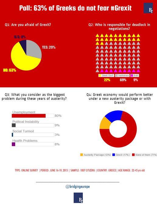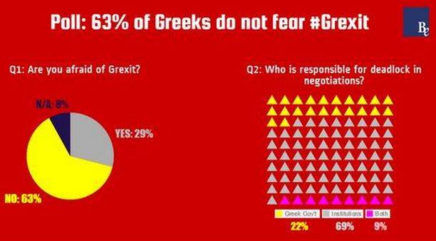 Σύμφωνα με δημοσκόπηση του ξένου ειδησεογραφικού site ”briedgingeurope”, το 63% των Ελλήνων δηλώνει πως δεν φοβάται το Grexit.