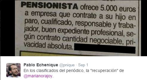 “Στις μικρές αγγελίες, η ανάκαψη του Μαριάνο Ραχόι”, έγραψε σε ένα μήνυμά του στο Twitter, που συνοδευόταν από φωτογραφία της αγγελίας, ο Πάμπλο Ετσενίκε, ηγετικό στέλεχος του αριστερού κόμματος Podemos.