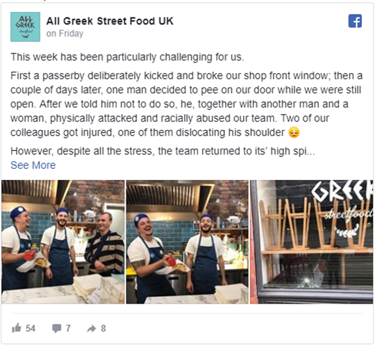 Αλλά όπως τονίζεται στο post του All Greek Street Food UK, δεν θα τους περάσει. «Παρά το άγχος, η ομάδα ανέκτησε την αισιοδοξία της, ψήνοντας και σερβίροντας σουβλάκι στον κόσμο. Όλοι εμείς στο All Greek Street Food UK είμαστε ενάντια στη βία και τον ρατσισμό, στηρίζουμε τη διαφορετικότητα, την ειρήνη και πάντα τη θετική αύρα. Μείνετε ασφαλείς, διασκεδάστε και ελάτε να γεμίσουμε τις πεινασμένα στομάχια σας με λίγο σουβλάκι» ήταν το μήνυμα του εστιατορίου.