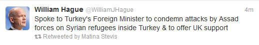 Ο Βρετανός υπουργός Εξωτερικών διεμήνυσε μέσω του twiter πως είπε στον υπουργό Εξωτερικών της Τουρκίας, Αχμέτ Νταβούτογλου, να καταδικάσει τις επιθέσεις των στρατευμάτων του Άσαντ κατά των Σύρων προσφύγων στην Τουρκία καθώς και να στηρίξει το Ηνωμένο Βασίλειο. Δείτε το tweet του William Hague: