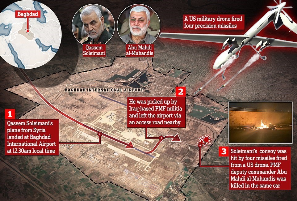 «Οι Φρουροί της Επανάστασης ανακοινώνουν ότι ο ένδοξος διοικητής των δυνάμεων του Ισλάμ, ο Χατζ Κασέμ Σουλεϊμανί, έπειτα από ζωή προσφοράς, έπεσε νεκρός, έγινε μάρτυρας σε επίθεση της Αμερικής εναντίον του αεροδρομίου της Βαγδάτης σήμερα το πρωί», αναφερόταν σε ανακοίνωσή τους που μεταδόθηκε από την ιρανική κρατική τηλεόραση.Πολιτικοί αναλυτές εκτιμούν πως ο αποκεφαλισμός της Αλ-Κουντς, της στρατιωτικής δύναμης ελίτ των Φρουρών της Επανάστασης με την εξόντωση του πανίσχυρου Σουλεϊμανί, καθώς και του συνασπισμού Χασντ αλ-Σάαμπι, με την εξόντωση του Αμπού Μάχντι αλ-Μουχάντις, του ανθρώπου του Ιράν στην Βαγδάτη και πραγματικού επικεφαλής της φιλοϊρανικής ιρακινής πολιτοφυλακής, φέρνουν το Ιράκ στα όρια του χάους.