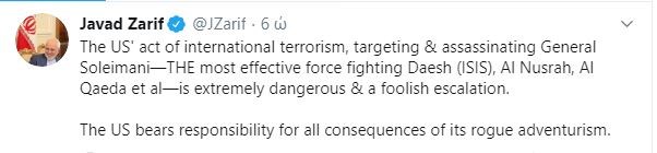 Το γεγονός πως ο Σουλεϊμανί «έγινε μάρτυρας» θα αυξήσει την «αποφασιστικότητα» του Ιράν να «αντισταθεί στον επεκτατισμό της Αμερικής και να υπερασπιστεί τις ισλαμικές αξίες μας», προστίθεται στο κείμενο.Επίσης, με ανάρτησή του στο Twitter, ο υπουργός Εξωτερικών του Ιράν Τζαβάντ Ζαρίφ, χαρακτήρισε την αμερικανική επιδρομή στη Βαγδάτη “εξαιρετικά επικίνδυνη και άφρονα κλιμάκωση”.