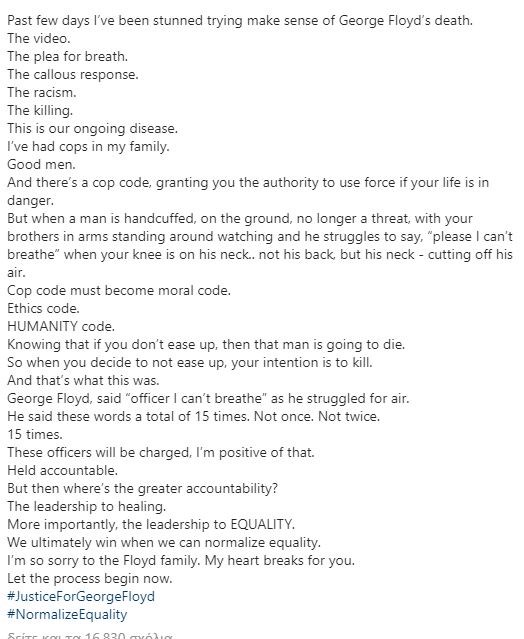 Με hashtag JusticeForGeorgeFloyd o 48χρονος Αμερικανός ηθοποιός έκανε ανάρτηση στο Instagram επισημαίνοντας πως “τις τελευταίες μέρες έκπληκτος προσπαθώ να κατανοήσω το θάνατο του Τζορτζ Φλόιντ. Το βίντεο. Η έκκληση για αναπνοή. Η άκαρδη απάντηση. Ο ρατσισμός. Η δολοφονία. Αυτή είναι η εν εξελίξει αρρώστια μας. Είχα αστυνομικούς στην οικογένειά μου. Καλοί άνδρες. Και υπάρχει ένας αστυνομικός κώδικας, που σου δίνει την εξουσία να χρησιμοποιείς τη βία αν κινδυνεύει η ζωή σου. Αλλά όταν ένας άντρας είναι με χειροπέδες, στο έδαφος, δεν αποτελεί πλέον απειλή”.