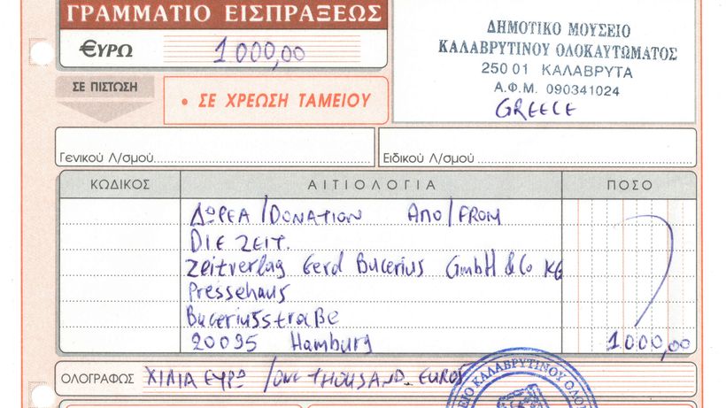 Στο ασυνήθιστο περιστατικό μιας ανώνυμης δωρεάς συνταξιούχου από την Βαυαρία προς τα Καλάβρυτα, ως συνεισφορά στις πολεμικές αποζημιώσεις που διεκδικεί η Ελλάδα από την Γερμανία, αναφέρεται διεξοδικά σημερινό δημοσίευμα της γερμανικής εφημερίδας «Die Zeit».