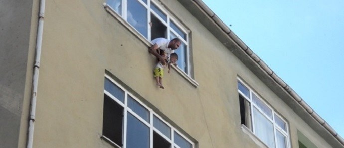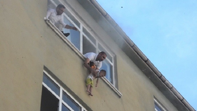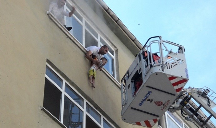 Με τους καπνούς να έχουν κατακλύσει το διαμέρισμα, ο πατέρας κρατούσε για αρκετή ώρα το αγοράκι έξω από το παράθυρο, έως ότου καταφθάσουν οι πυροσβέστες με γερανοφόρο όχημα.