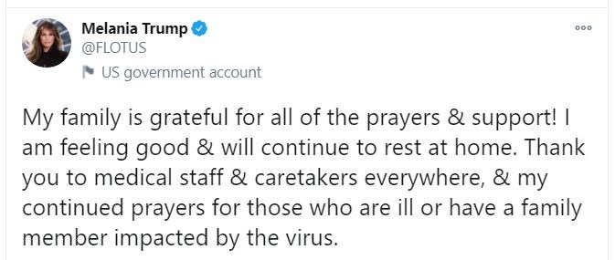 Μετά την ανακοίνωση της ΜακΕνάνι ότι βρέθηκε θετική και πως ήταν ασυμπτωματική, η Πρώτη Κυρία των ΗΠΑ Μελάνια Τραμπ, με ανάρτησή της, επίσης, στο twitter είπε πως νιώθει καλά και ότι θα συνεχίσει τη διαδικασία της ανάρρωσης στο σπίτι. “Η οικογένειά μου είναι ευγνώμων για όλες τις προσευχές και τη συμπαράσταση! Νιώθω καλά και θα συνεχίσω να ξεκουράζομαι στο σπίτι. Ευχαριστώ το ιατρικό προσωπικό παντού και στέλνω τις προσευχές μου σε όσους έχουν ασθενήσει ή έχουν ασθενή κάποιο μέλος της οικογένειάς τους”.