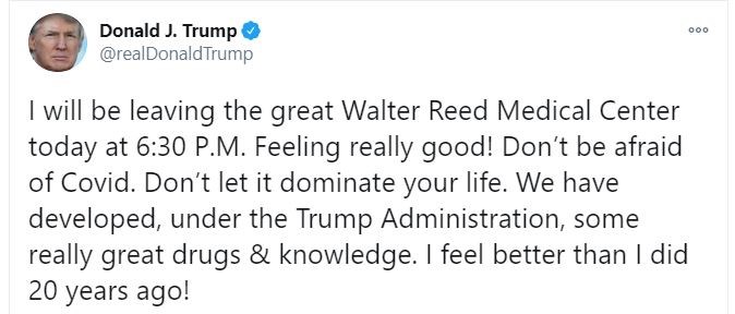 Πάντως ο ίδιος ο Τραμπ ανακοίνωσε με ανάρτησή του στο twitter ότι θα πάρει εξιτήριο στις 18.30 τοπική ώρα σήμερα. Αφού ανέφερε ότι αισθάνεται καλά πρόσθεσε: “Μην φοβάστε την COVID. Μην τον αφήνετε να κυριαρχήσει στη ζωή σας. Έχουν αναπτυχθεί, υπό τη διοίκηση Τραμπ, κάποια πραγματικά εξαιρετικά φάρμακα και γνώση. Αισθάνομαι καλύτερα απ’ ό,τι όταν ήμουν 20 χρονών”, έγραψε.