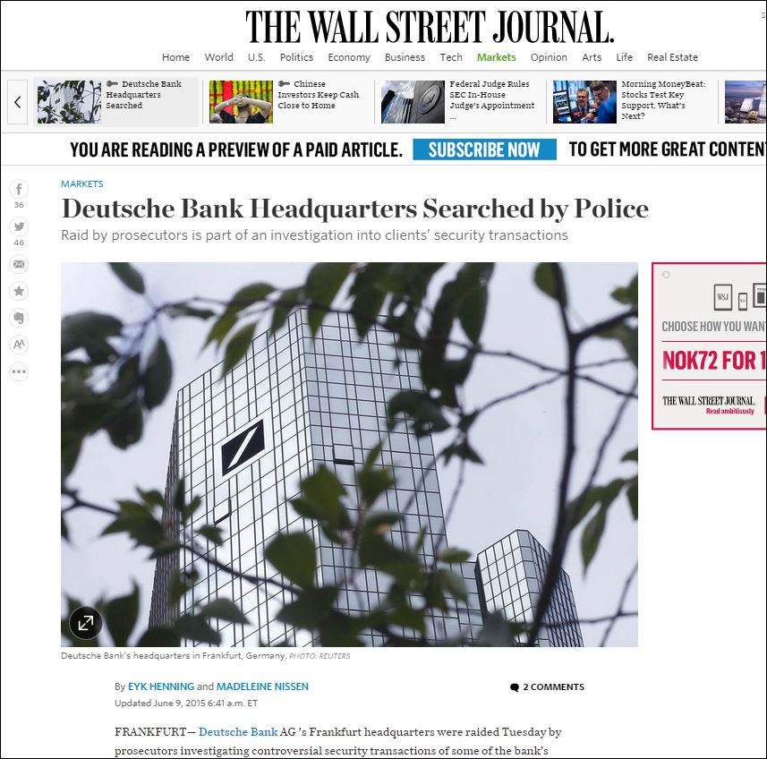 Σύμφωνα με τη Wall Street Journal, εκπρόσωπος της Deutsche Bank ανέφερε ότι δεν έχουν επιβληθεί κατηγορίες κατά του προσωπικού της μεγαλύτερης γερμανικής τράπεζας. Παράλληλα, πηγές που επικαλείται η εφημερίδα σημειώνουν ότι οι πελάτες της Deutsche Bank εμπλέκονται σε συναλλαγές που χρησιμοποιήθηκαν από επενδυτές και τράπεζες για μείωση φόρων.